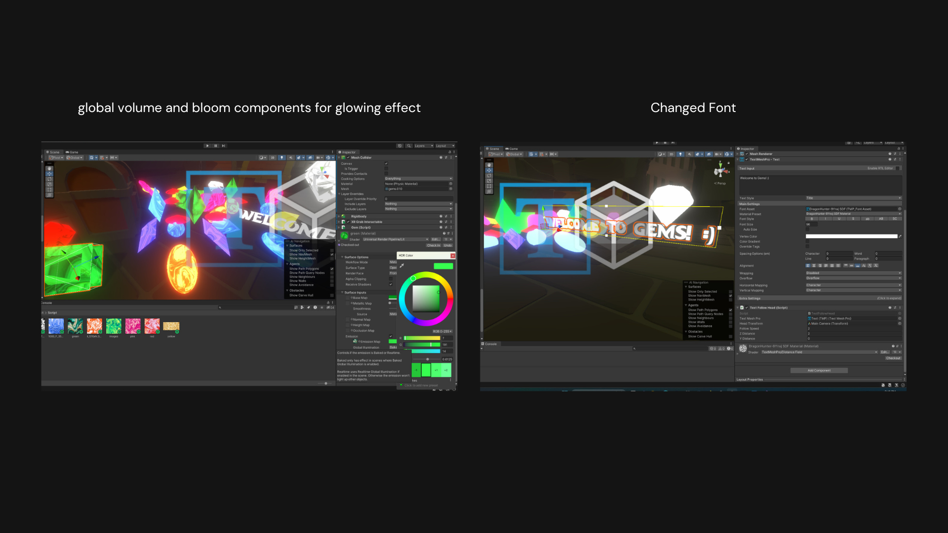 I adjusted the material textures and experimented with the emission settings to give the gems a more realistic look. I was encouraged to use the global volume and bloom components to add a glowing effect, enhancing the gems’ appearance.